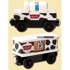 The people on the Island of Sodor need milk, and they can always count on the Sodor Dairy Cars to deliver it! The children especially love to see the Dairy Cars and hear the cows moo as they pass by. The Dairy Cars play a "moo" sound when a little engineer slides the side door open. Also includes a milk barrel car. They're made with real wood and connect with magnet connectors. Each car measures approximately 3".